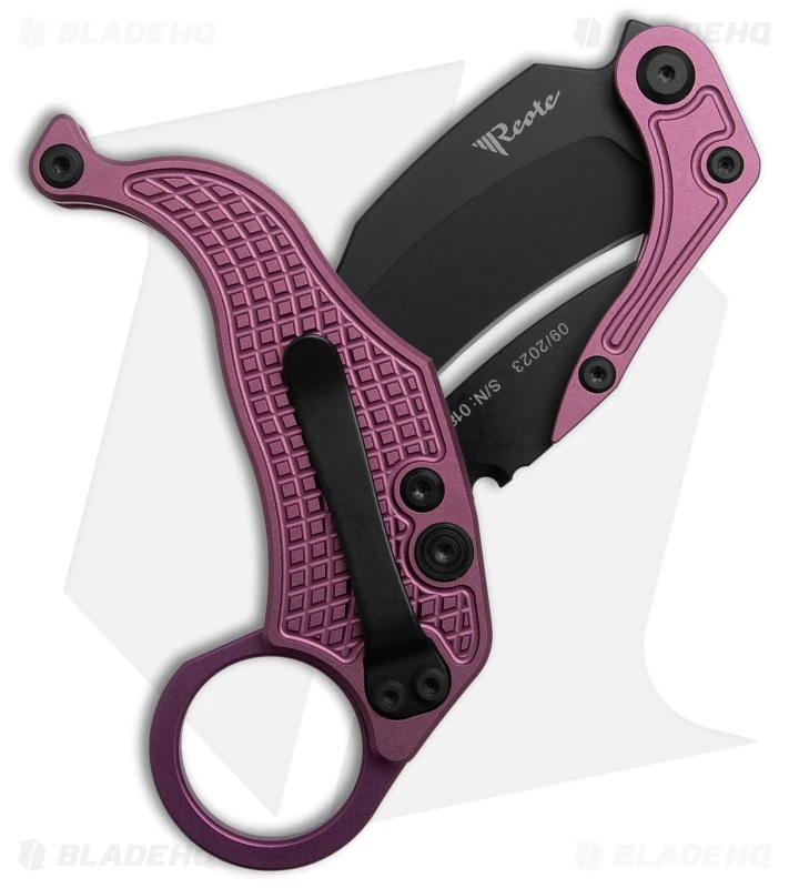 - Handle: Purple-anodized aluminum handle scales with frag-texture milling and a titanium backspacer.