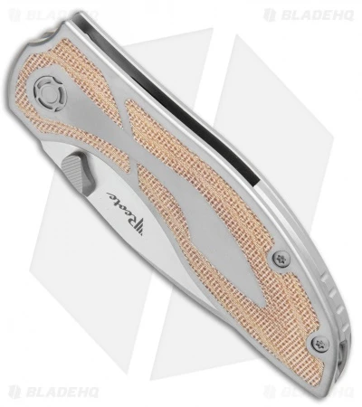 This thumb stud Iron model has a titanium handle with brown micarta inlays.