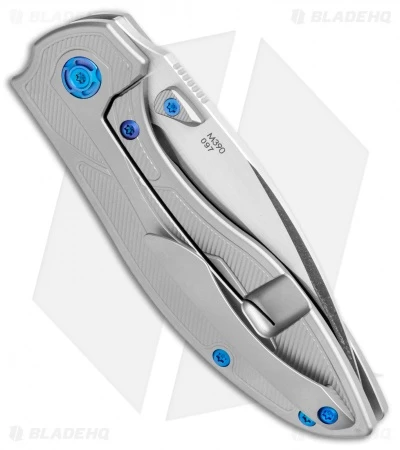 This thumb stud Iron model has a titanium handle with green micarta inlays and blue anodized hardware.