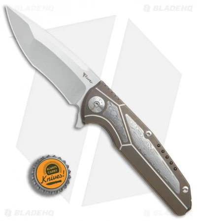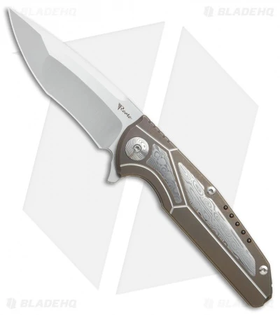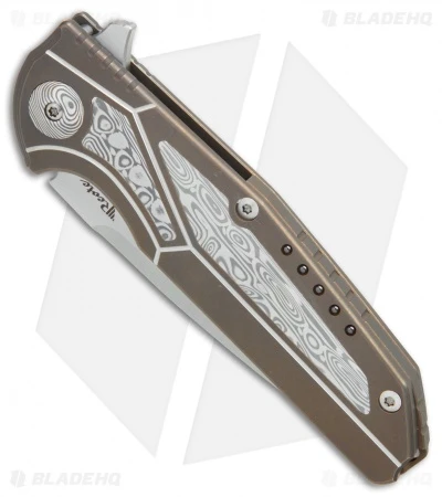 This K-4 model has a satin finished Bohler M390 blade and a bronze anodized titanium handle. It comes outfitted with Damascus inlays and satin hardware.
